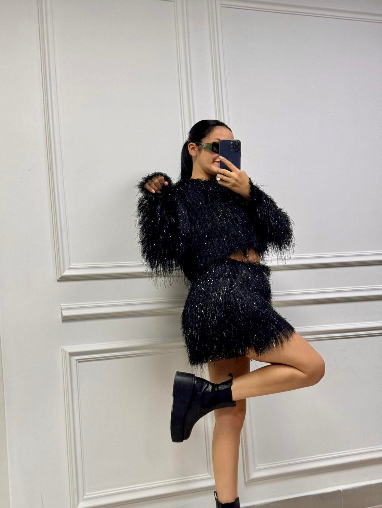 Son moda trendlerinde yer alan saçak detayıyla dikkat çeken şık bir bluz ile mini etek kombinasyonu.