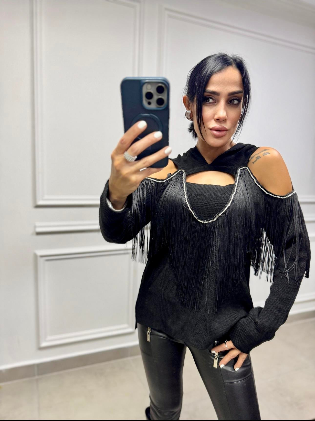 Bu sezonun trendini yakalamanın en şık yolu: Taşlı Omuz İp Saçaklı Triko!