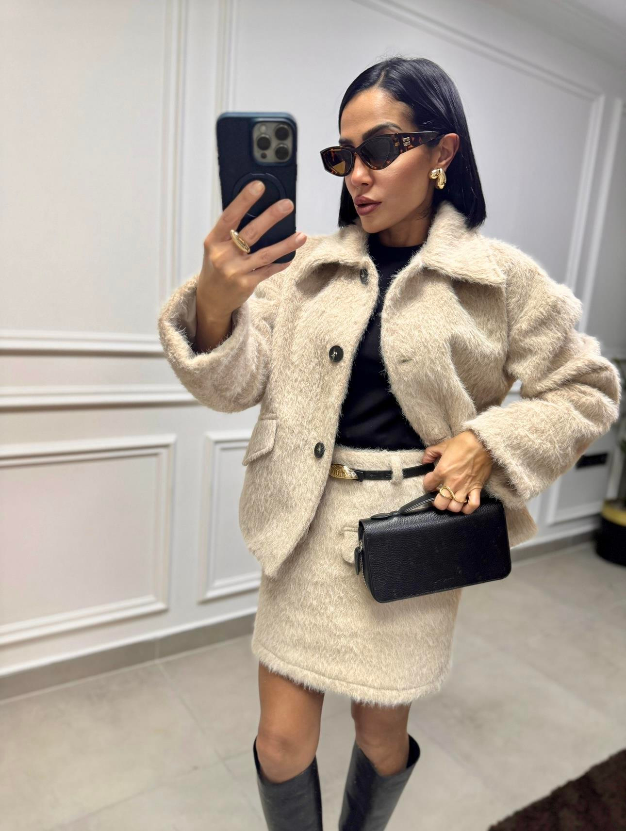 Şık ve modern gömlek yaka ceket ile mini eteğin mükemmel kombinasyonu!