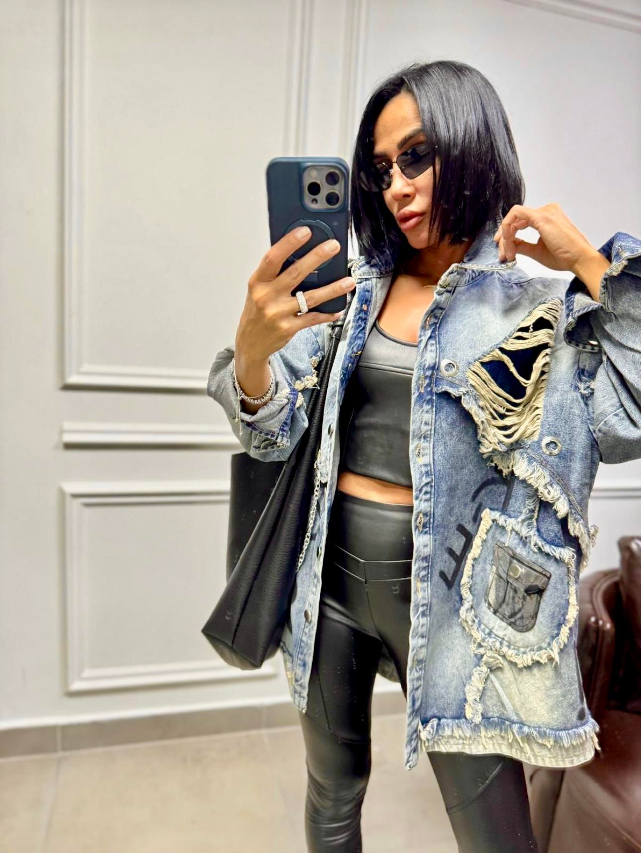 Yüksek kaliteli kot kumaştan üretilmiş lazer kesim detayları ile şık bir görünüm sunar.