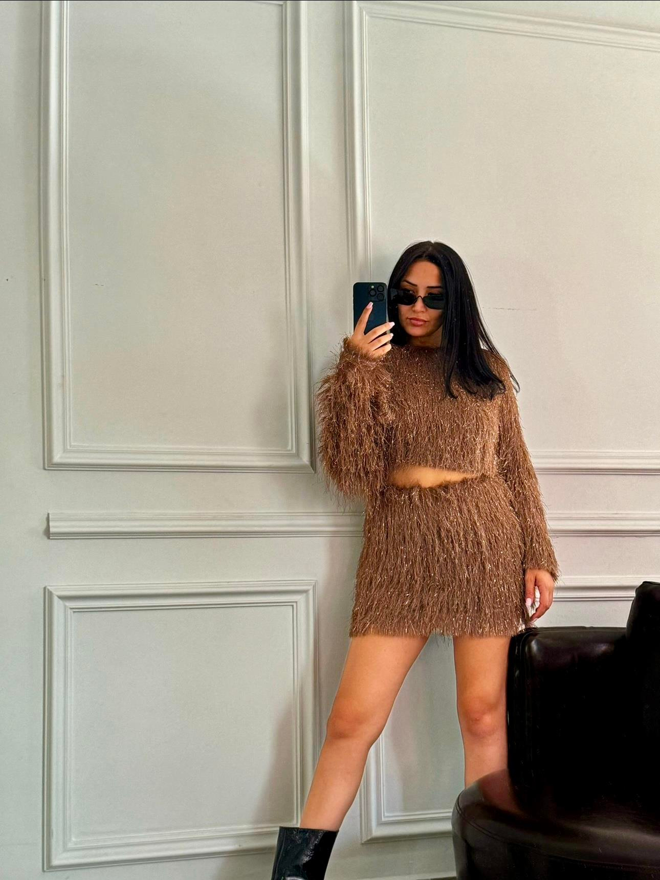 Son moda trendlerinde yer alan saçak detayıyla dikkat çeken şık bir bluz ile mini etek kombinasyonu.
